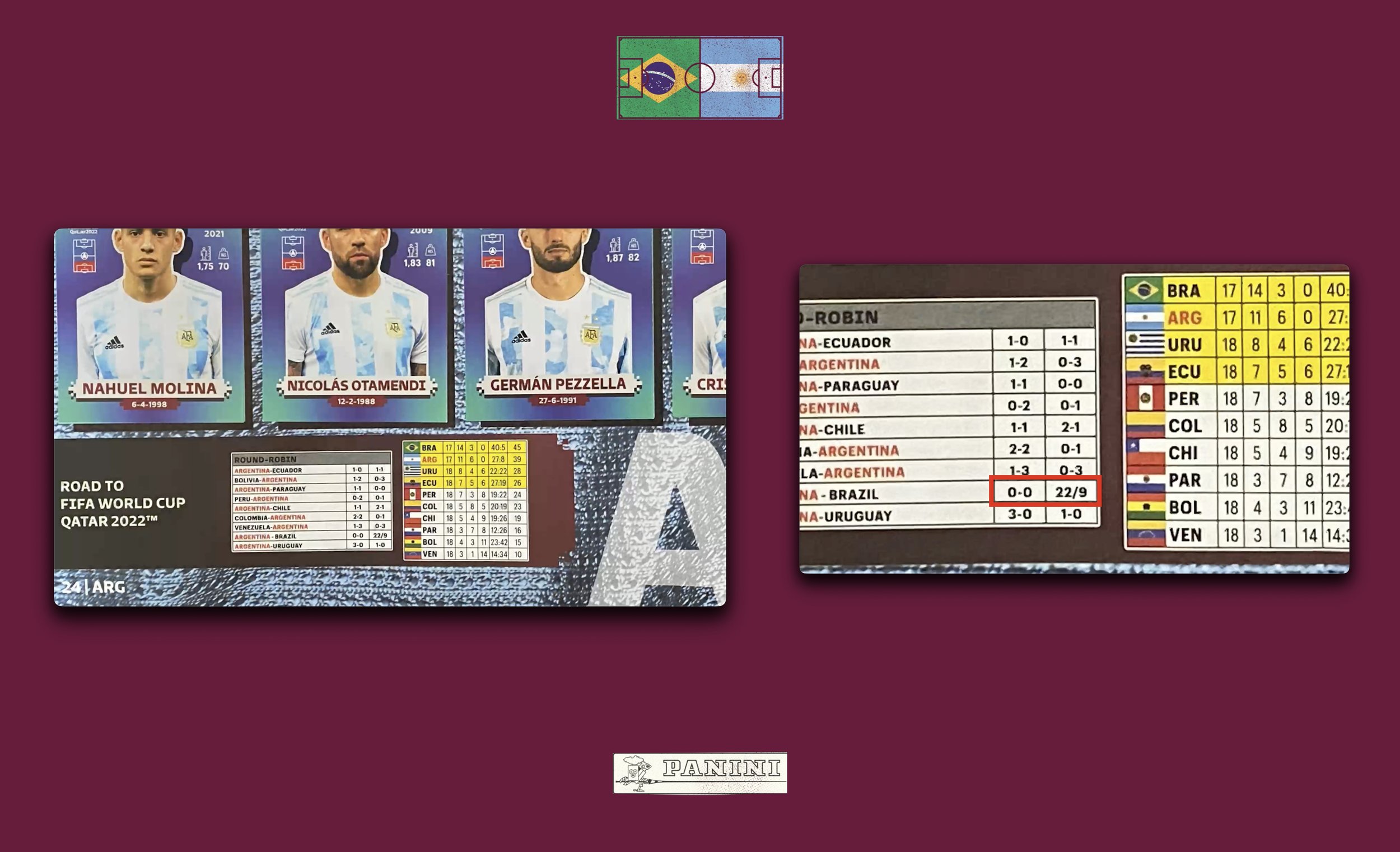 O jogo entre Brasil e Argentina pelas Eliminatórias da Copa-22 foi cancelado pela FIFA por descumprimento de protocolos da COVID-19, o que fez com que o álbum da Panini (já lançado em todo país) ficasse incompleto.